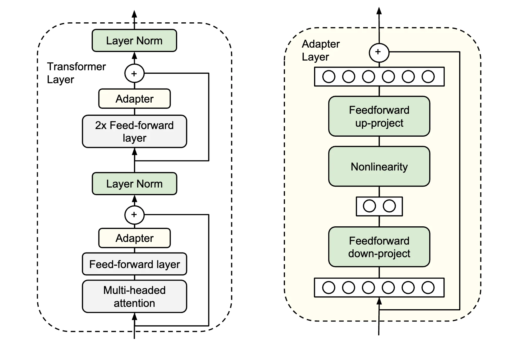 An adapter is basically a tiny “bottleneck” module inserted into each transformer layer. It consists of: