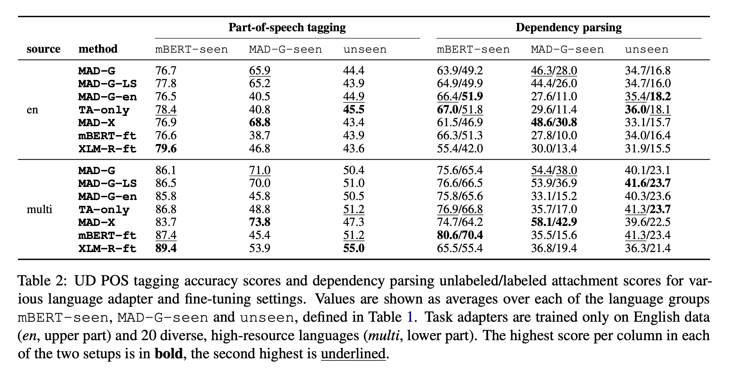 - Note that performance of MAD-G-en is worse than MAD-G in MAD-G-seen languages.