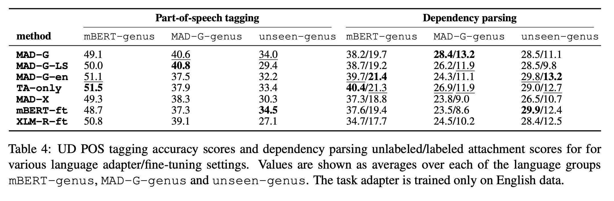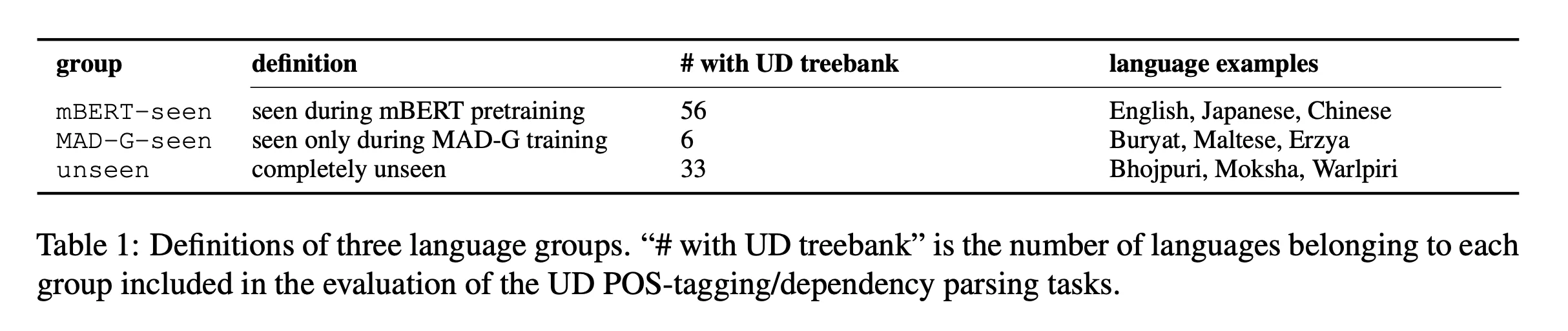 - Note that while MAD-G aims to generalize, it can only do so for languages whose ‘typology relative’ is available during training.